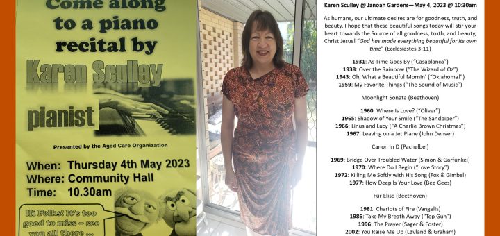 Blog / Ecclesiastes / Family / Karen piano / singing live / Music at Janoah May 4, 2023 Janoah Gardens piano recital – May 4th, 2023