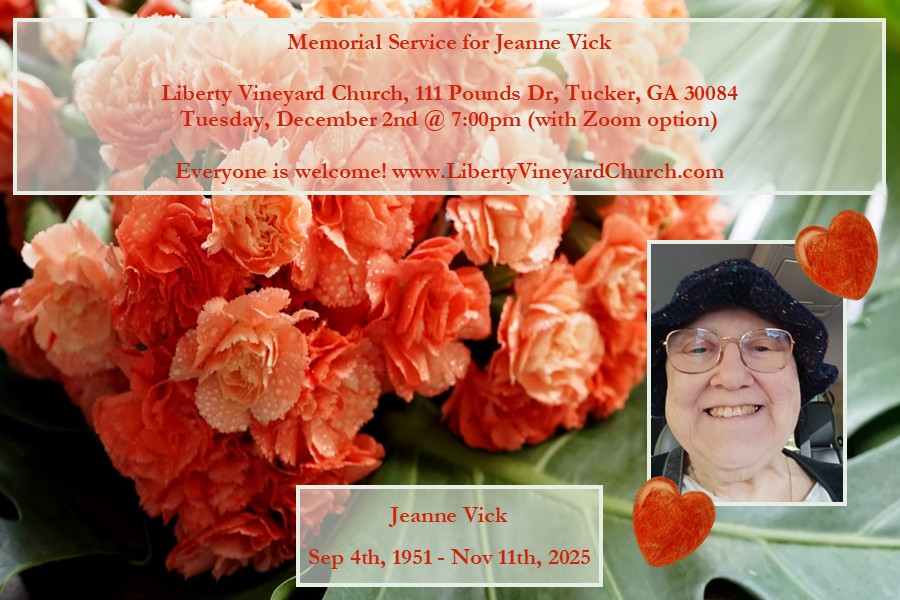 Today we celebrated the beautiful life of our dear friend, Jeanne Vick, whose memorial service was hosted by Liberty Vineyard Church and attended by family and friends. We will greatly miss Jeanne, especially at Liberty Vineyard, her church home for the last 12 years (at one time attended by four generations of the Vick family!).