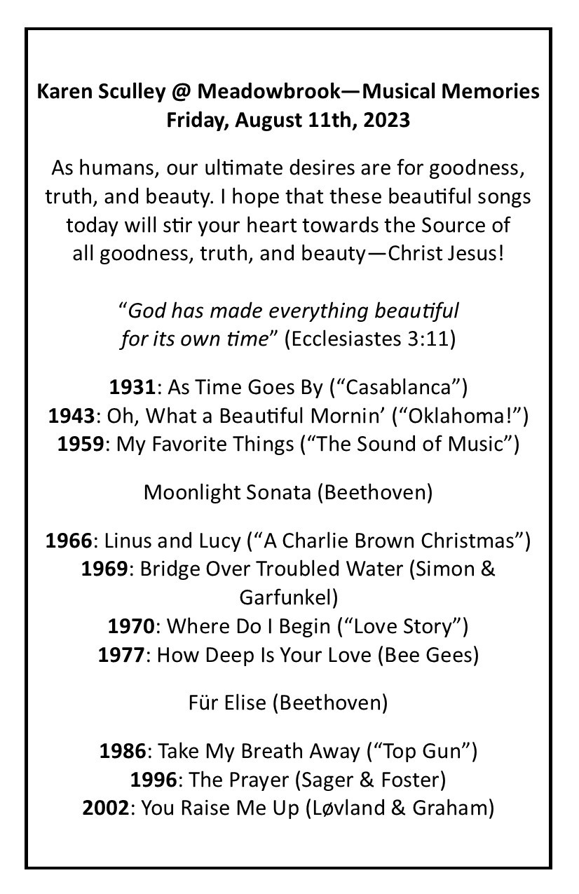 Karen’s Musical Memories 2023 (Music and Ministry at Meadowbrook)