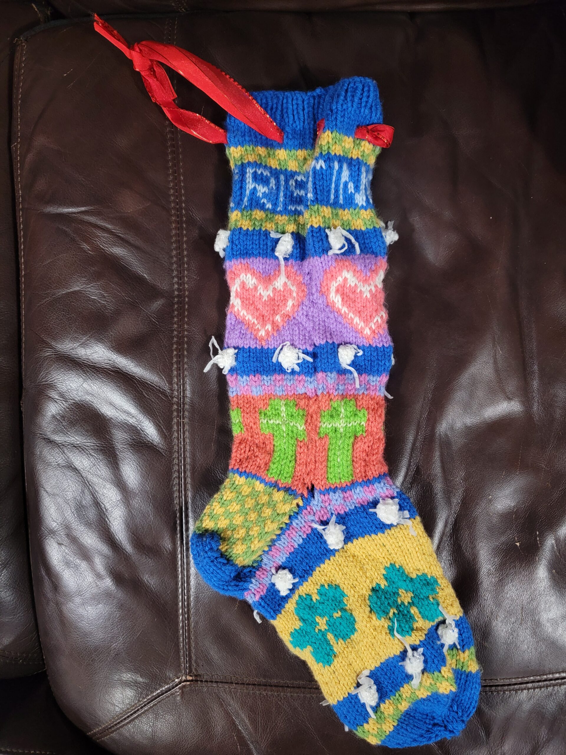 Here is how to make knitted Christmas stockings like the one shown here (scroll to the bottom of this page to see many other examples of stockings I’ve made – the possibilities are endless – it’s such a joy to see the delight this simple gift brings to each one). I’ve developed this pattern over the years and customize each Christmas stocking according to a number of factors (e.g. favorite colors, incorporate elements they might enjoy, suggestions from someone in the family, their national flag colors, etc.) Aditi started helping me design stockings in 2022 – the newer ones look awesome because of that 🙂 Creative collaboration is one of my favorite things! If you are not confident that you can do this, please find a more experienced knitter who can encourage you in person, and give it a try! There are many knitting groups around – someone will be sure to want to help you out!