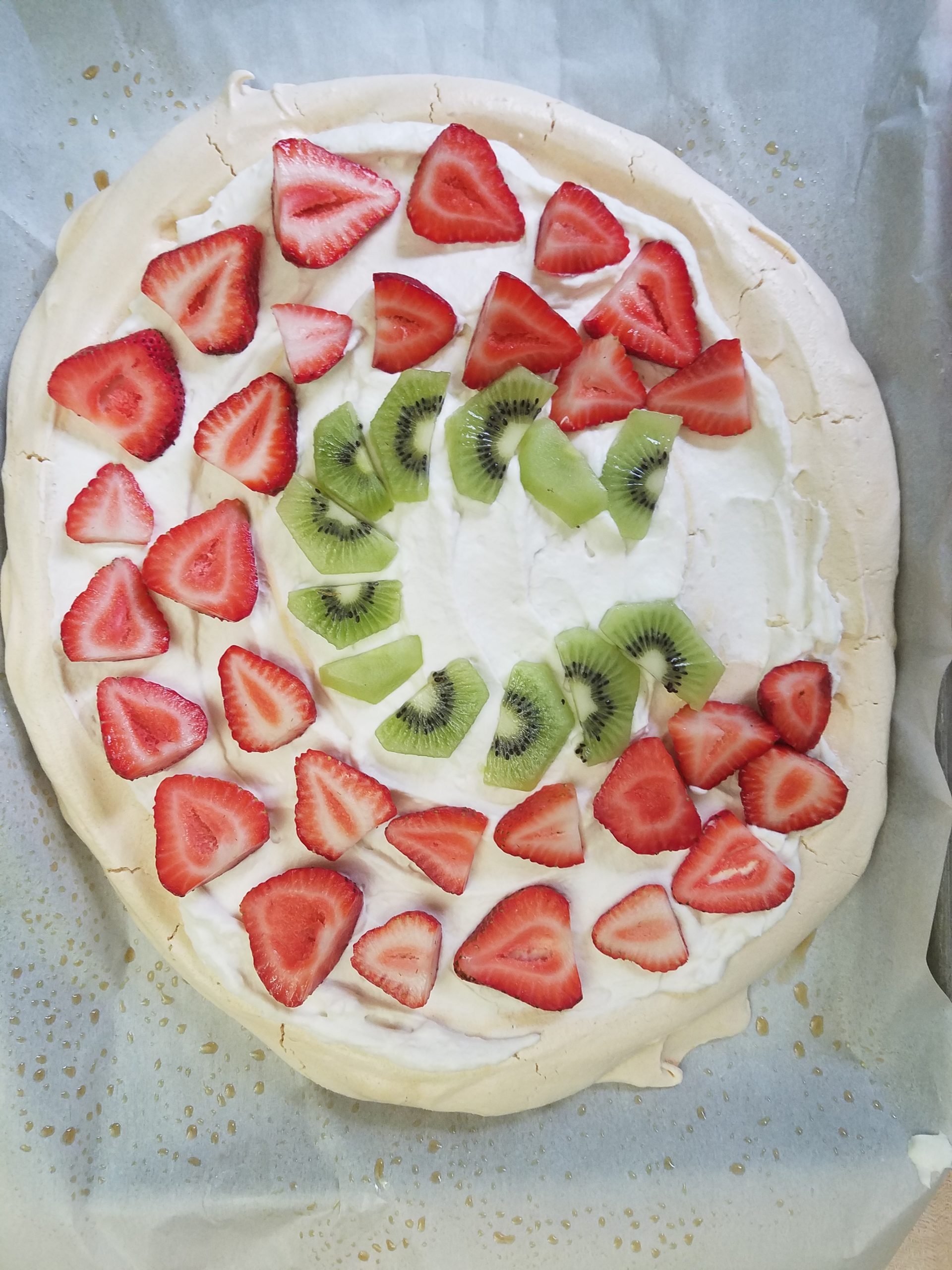 Shortly before serving, wash and slice the fruit. Whip the cream with the vanilla and icing sugar until it forms peaks and set aside. Gently spread the cream over the top of the cooled meringue with a spatula. Top with fruit. Serve and enjoy! 🙂