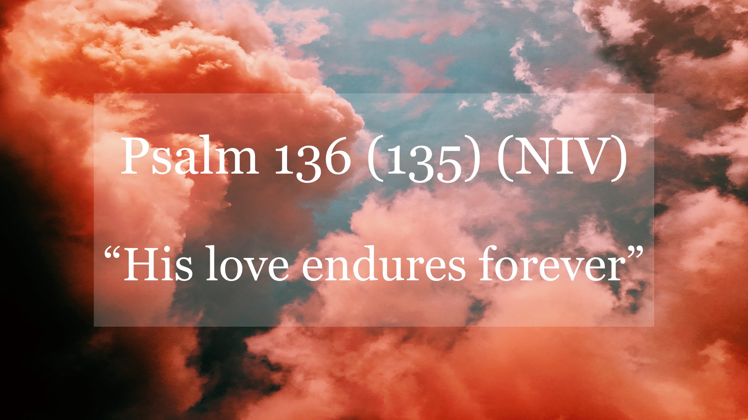 Psalm 136 (NIV) – “1 Give thanks to the Lord, for he is good. His love endures forever. 2 Give thanks to the God of gods. His love endures forever. 3 Give thanks to the Lord of lords: His love endures forever. 4 to him who alone does great wonders, His love endures forever. 5 who by his understanding made the heavens, His love endures forever. 6 who spread out the earth upon the waters, His love endures forever. 7 who made the great lights—His love endures forever. 8 the sun to govern the day, His love endures forever. 9 the moon and stars to govern the night; His love endures forever. 10 to him who struck down the firstborn of Egypt His love endures forever. 11 and brought Israel out from among them His love endures forever. 12 with a mighty hand and outstretched arm; His love endures forever. 13 to him who divided the Red Sea asunder His love endures forever. 14 and brought Israel through the midst of it, His love endures forever. 15 but swept Pharaoh and his army into the Red Sea; His love endures forever. 16 to him who led his people through the wilderness; His love endures forever. 17 to him who struck down great kings, His love endures forever. 18 and killed—mighty kings—His love endures forever. 19 Sihon king of the Amorites His love endures forever. 20 and Og king of Bashan—His love endures forever. 21 and gave their land as an inheritance, His love endures forever. 22 an inheritance to his servant Israel. His love endures forever. 23 He remembered us in our low estate His love endures forever. 24 and freed us from our enemies. His love endures forever. 25 He gives food to every creature. His love endures forever. 26 Give thanks to the God of heaven. His love endures forever.”