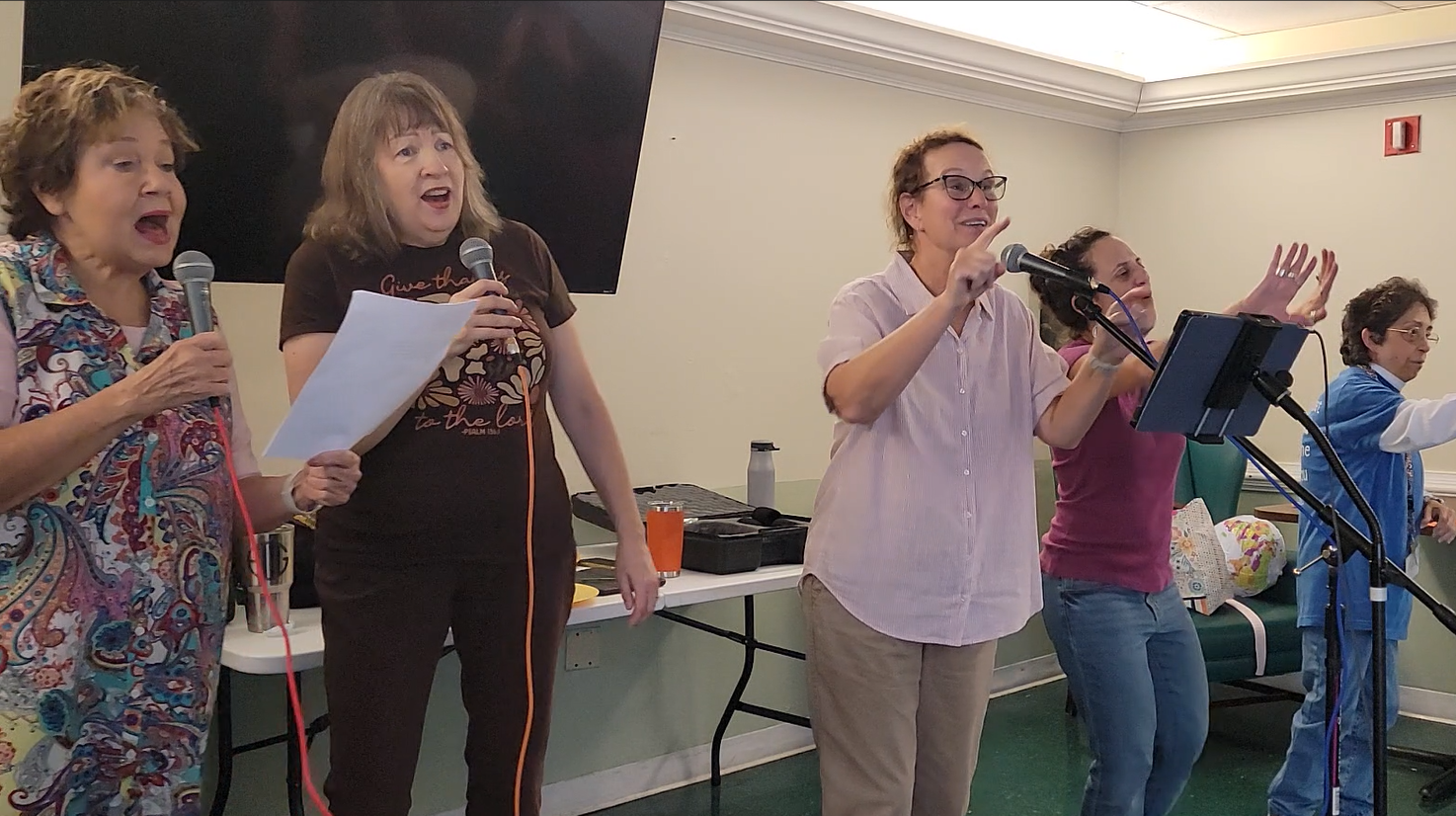 We had a beautiful time with our friends, those in residence, rehab, or responsibilities at Meadowbrook. God’s presence among us was sweet as we poured our hearts out to God in song, in dance, and by being present with one another. Paul did a great job with all the tech, JR prepared delicious treats (pound cake and fresh blueberries) and reminded us of ways in which we can be thankful for all our many blessings, Pam MC-ed and moved and mingled with joy, Shelly shared creative props and her caring presence, while Tamera, Patricia, and Karen sang the songs. It was a precious time together thanking God, no matter what is happening in our lives, through all the highs and lows that life inevitably brings.